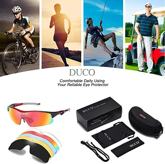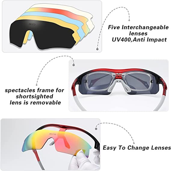 1* Sport Glasses Frame 、5* Lenses(The Gray Lens is Polarized) 、1* Hard Protection Box 、1* Glasses Bag 、1* Cleaning Cloth